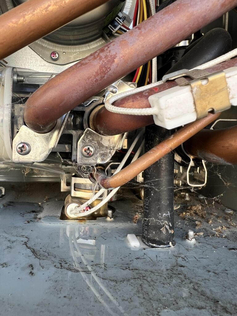 今は検針業務の時期なのですが、検針に行ったお宅で給湯機の下が水で濡れているのを発見しましたので、お客さんにお伝えしてから給湯機を点検しました。