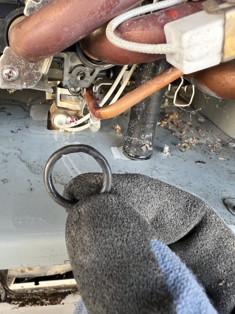 水漏れと行っても給湯機からジャージャー出てるってわけではなくて、ポタリポタリと垂れてくる感じだったので、中を見てみるとOリングの劣化で漏れている感じ。